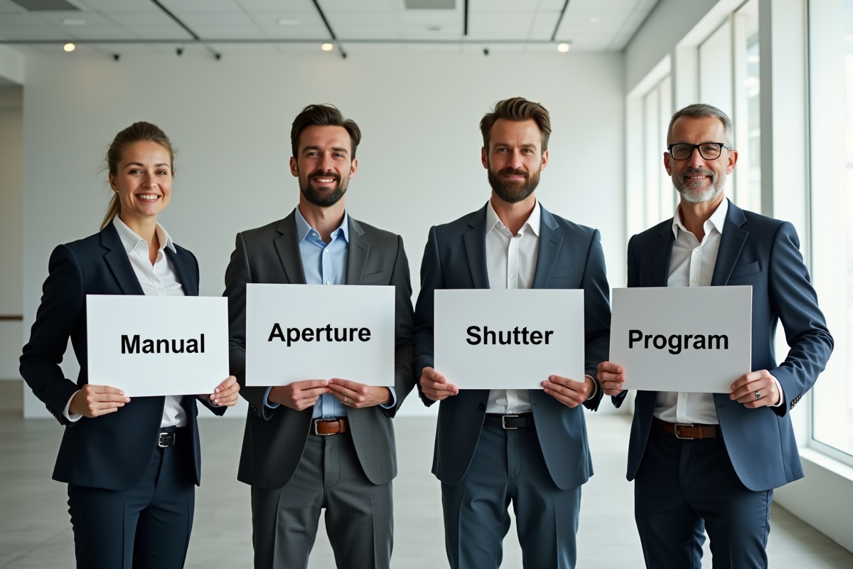 Groupe de personnes habillées élégamment avec panneaux sur le thème de la photographie